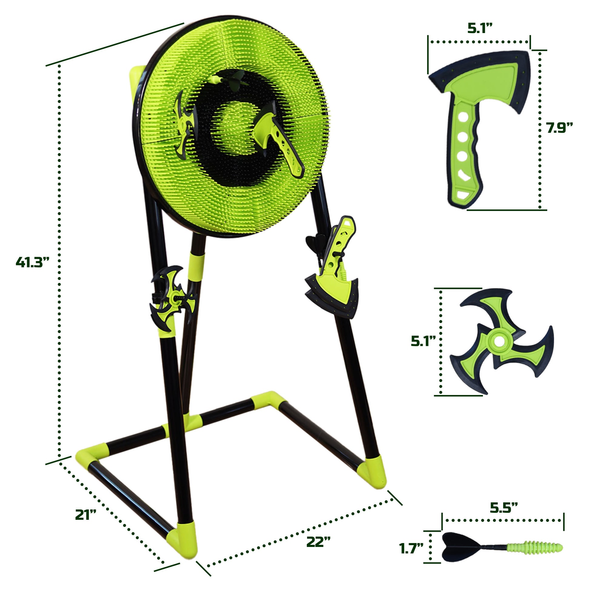 Bristle target board, 3 darts, 3 ninja stars, and 3 axes
